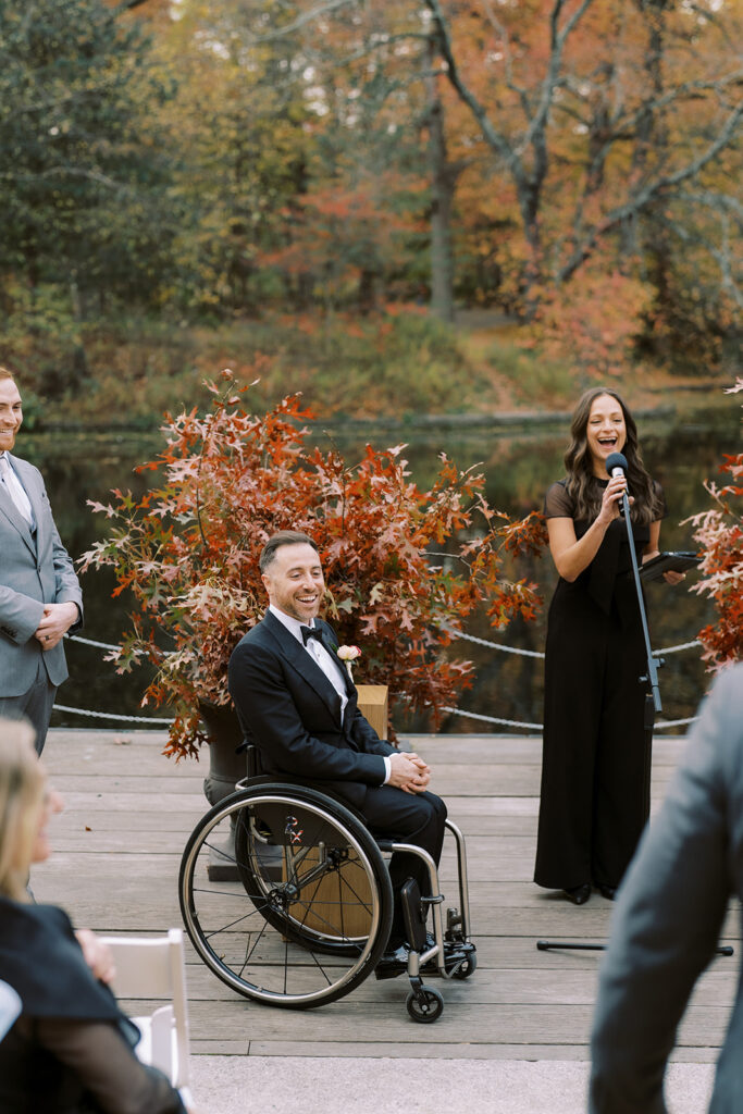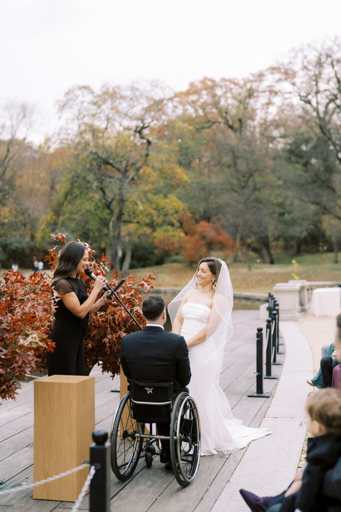 Their ceremony was especially stunning because the “florals” outside were not traditional florals at all. They were these large, dramatic arrangements of red fall leaves that made such a statement and somehow felt both elevated and totally right for the location. And if you have ever been at the Boathouse, you know one little wild card is the water. Some days, especially when it is warm, it can turn really green. But we got lucky. It had cleared up, and between the water behaving, the weather being perfect, and the park still holding onto those colors, it honestly could not have been a better day.