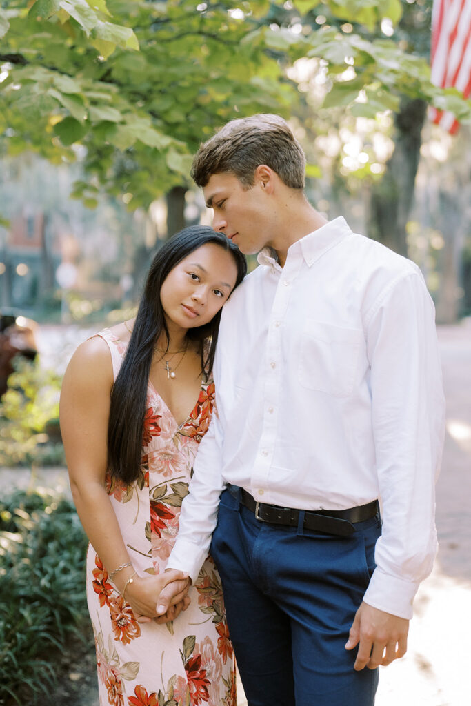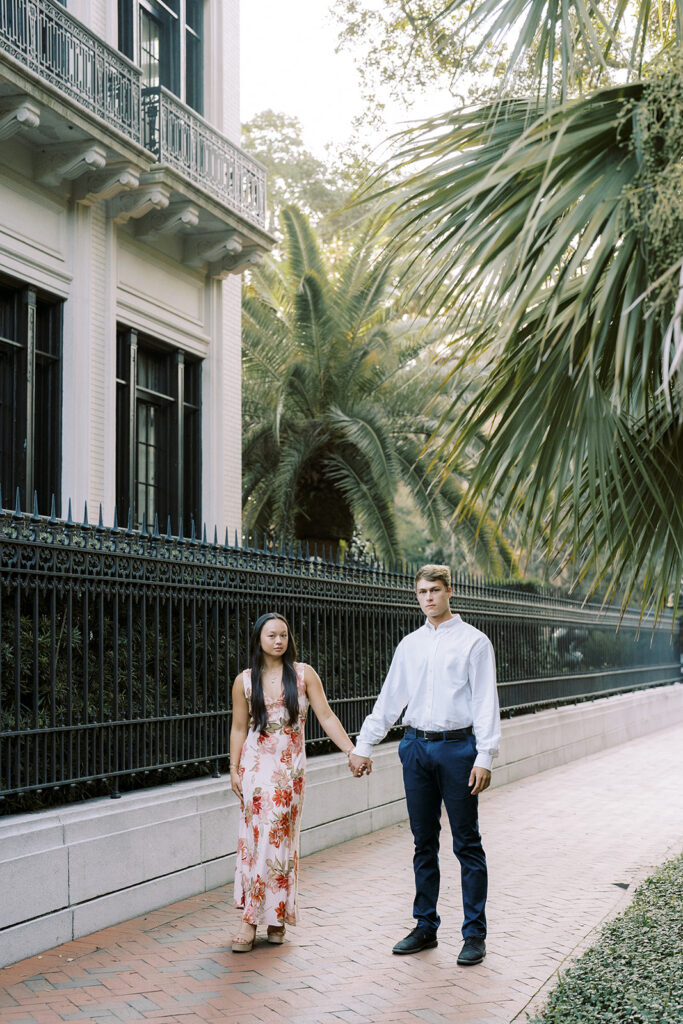 Because I live in NYC, I’m always recommending early morning engagement sessions. It’s the easiest way to beat the crowds and keep things feeling relaxed and unrushed. But in Savannah, it was next level peaceful. We basically had Forsyth Park to ourselves, and the whole morning had that soft, glowy light that makes everything feel a little more romantic.